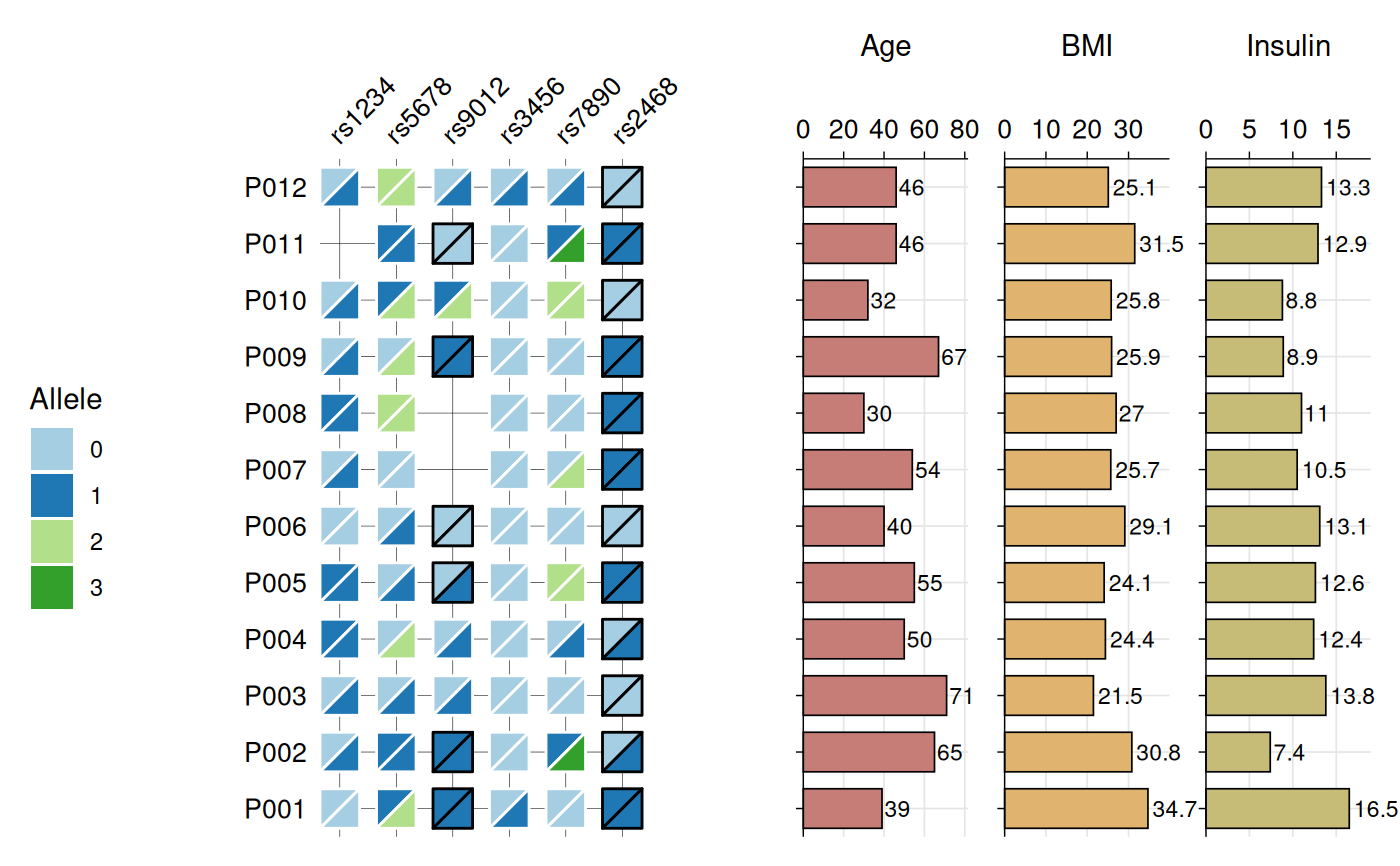 Creates a heatmap visualization of biallelic genotypes (e.g., SNPs, variants) with split-tile representation showing phased or unphased alleles. Each tile is divided diagonally to display both alleles, with border color indicating phasing status (black for phased, white for unphased). Optional barplots can be added to display associated numeric data.