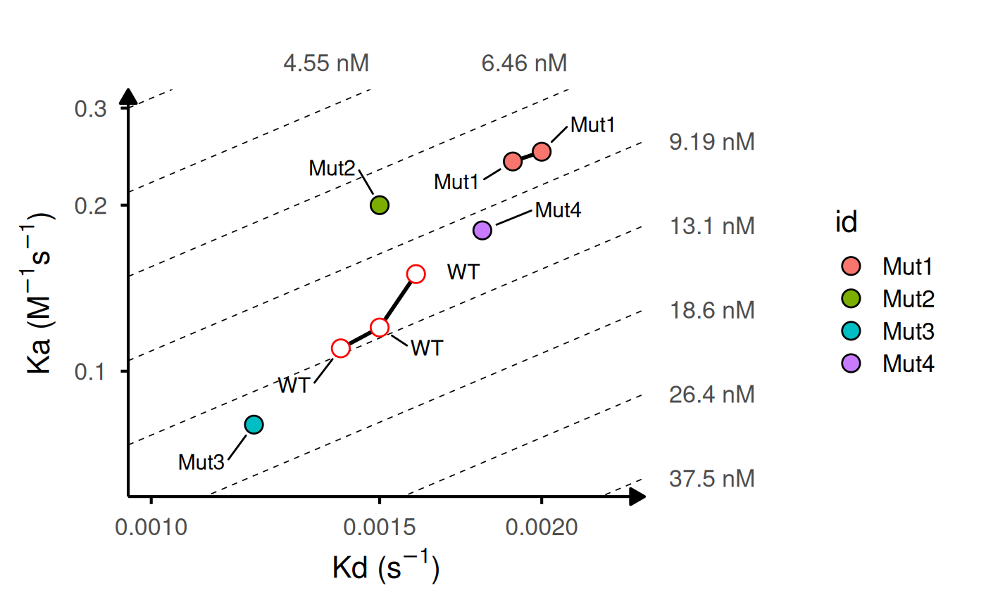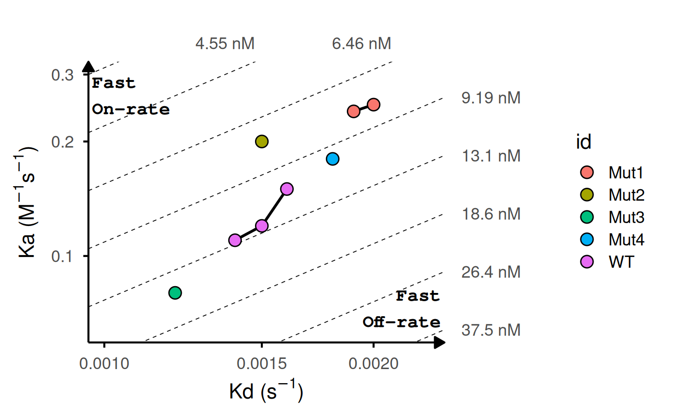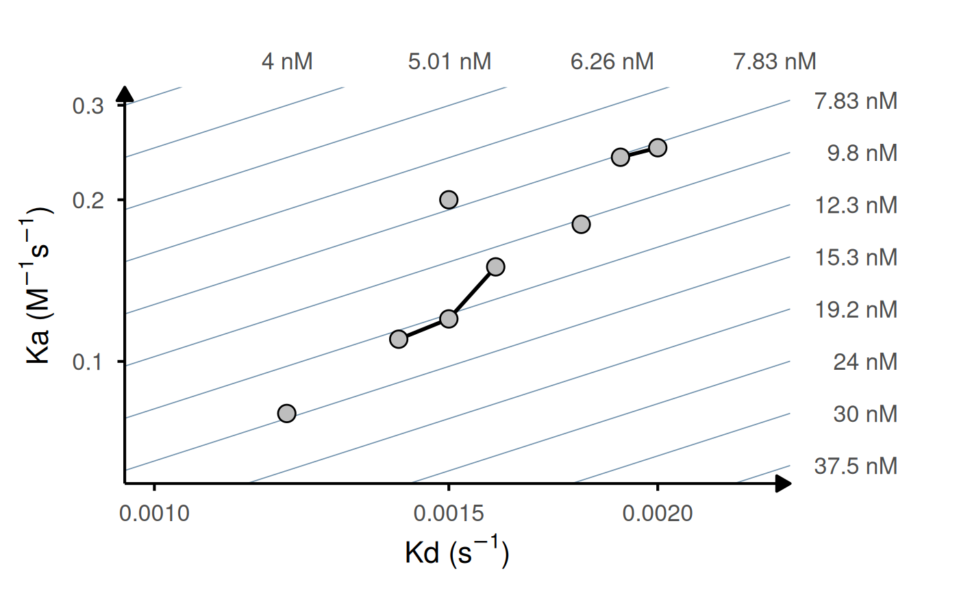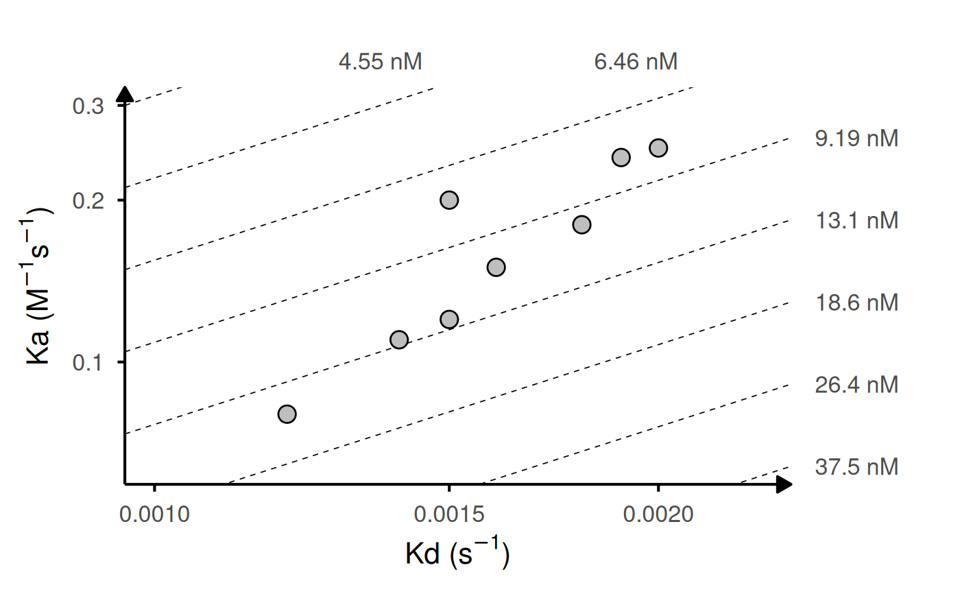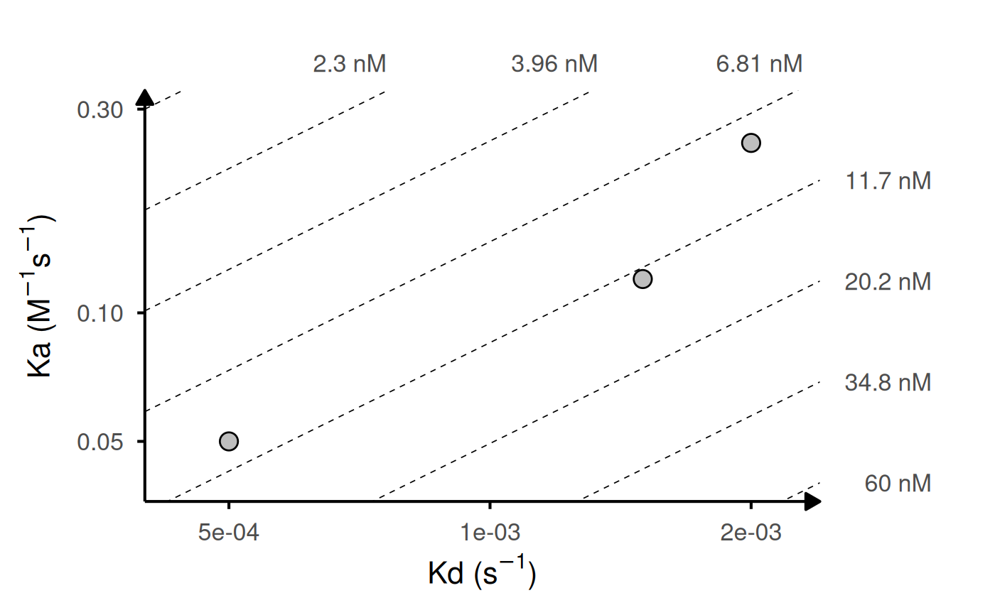 Generates a log-log plot of association rate (ka) vs dissociation rate (kd) with iso-affinity (KD) lines. Useful for visualizing kinetic binding data from surface plasmon resonance (SPR), biolayer interferometry (BLI), or other biophysical assays.