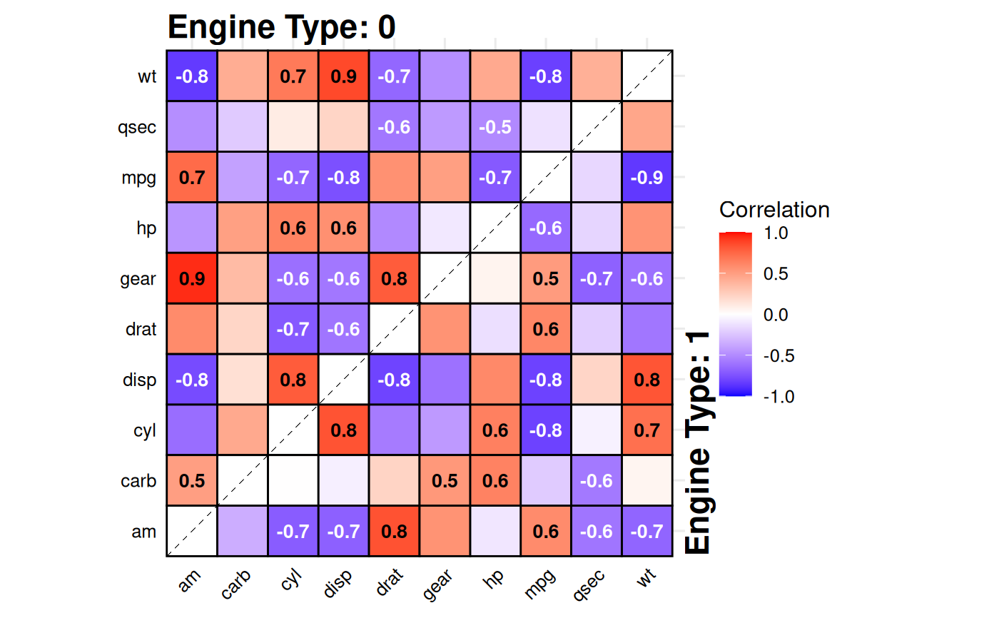 cor_p()).Combines the upper triangle from one group and lower triangle from the other.