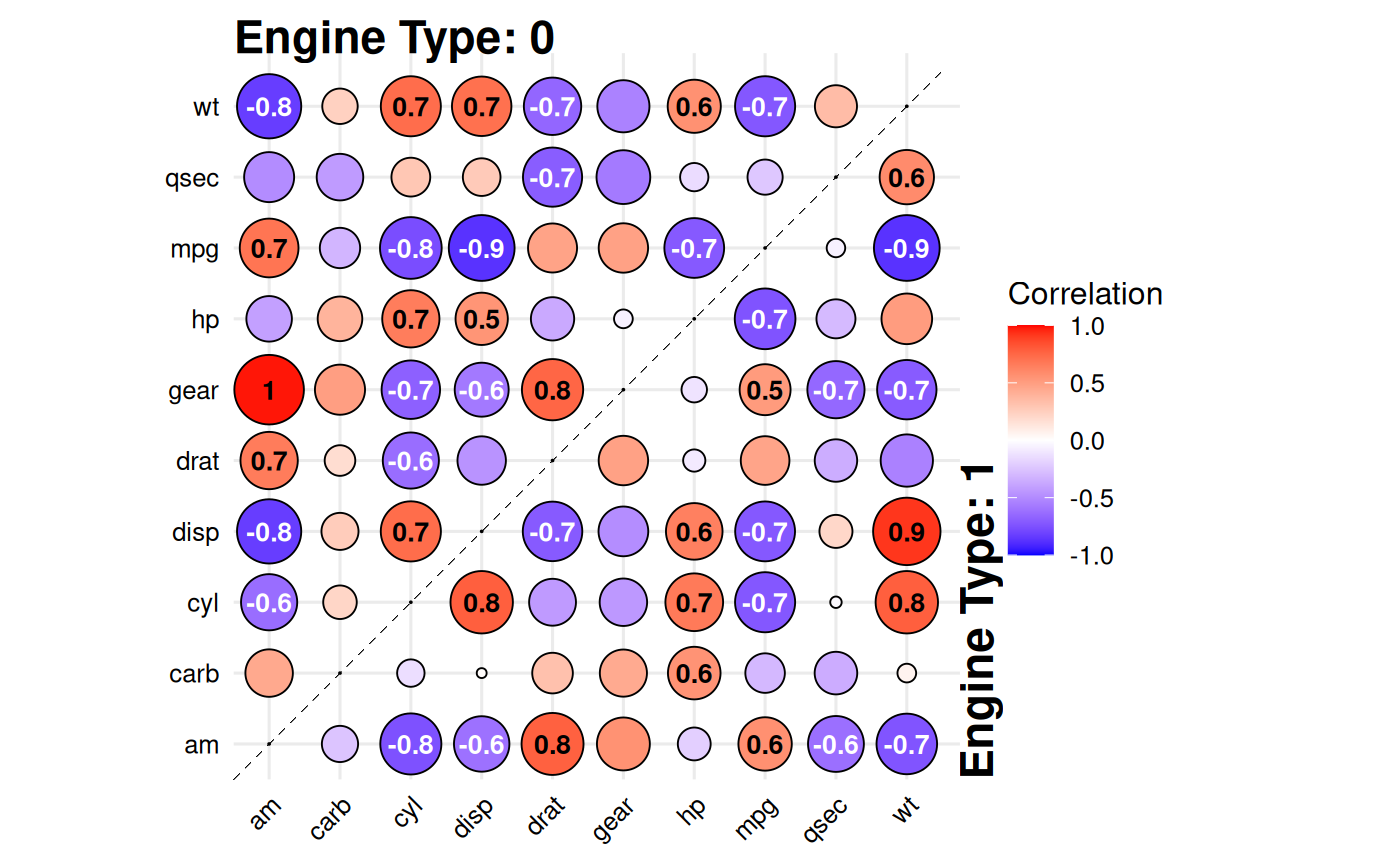 The result is a heatmap (or bubble plot) showing both groups' correlation patterns in a single compact visualization.